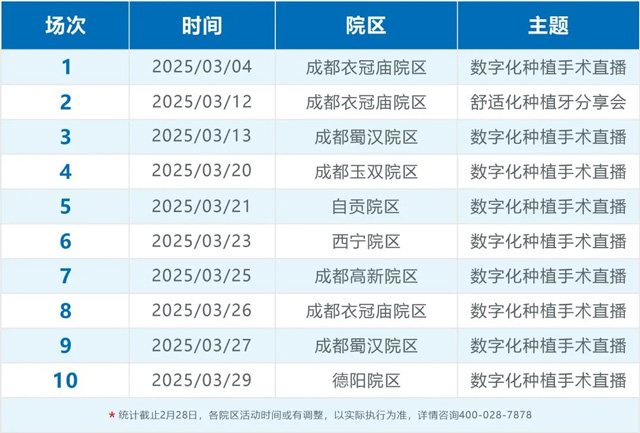 2月直播活动圆满落幕,但新桥口腔的脚步从未停止!3月春意更浓,应广大缺牙市民呼声,我们准备了更多场次的数字化种植牙直播及舒适化种植牙分享会活动。如果您也有种牙需求,也想更深入了解种植牙,可任意选择下表中的活动,拨打400-028-7878报名参加。各场次接待名额有限,先到先得!