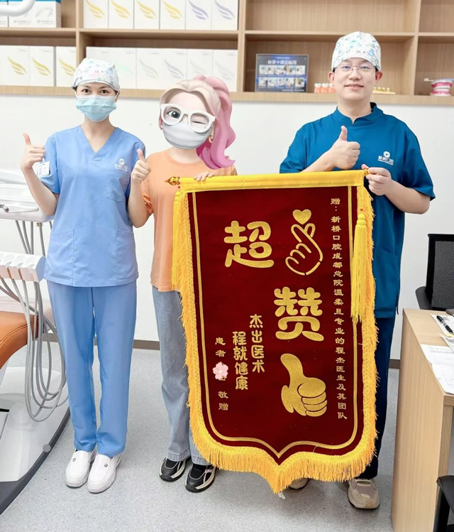 近日,新桥口腔成都总院(成都人南新桥口腔医院)种植专科程杰医生收到了一面格外吸睛的锦旗红彤彤的缎面上,超赞两个大字跃然眼前,下方金色大拇指高高竖起,旁边还有一个温暖的比心手势,侧旁一行稍小的标……