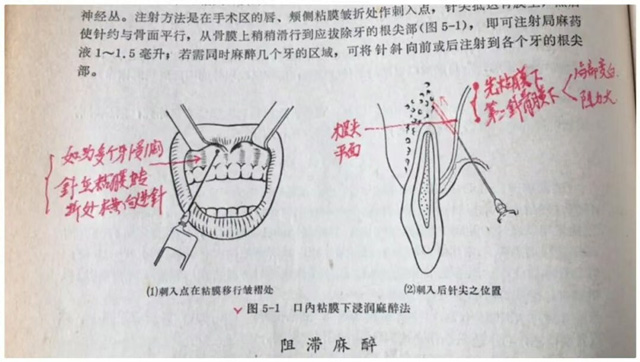 包括上牙麻醉、下牙麻醉的操作技巧,如何避开附近的神经,避免和减少并发症发生,他一一结合口腔解剖图进行了详细的讲解,包括上牙槽后神经阻滞麻醉口内注射法、口内粘膜下浸润麻醉法、眶下神经阻滞麻醉口外注射法、眶下神经阻滞麻醉眶下孔口内注射法、鼻腭神经阻滞麻醉、下牙槽神经阻滞麻醉等。